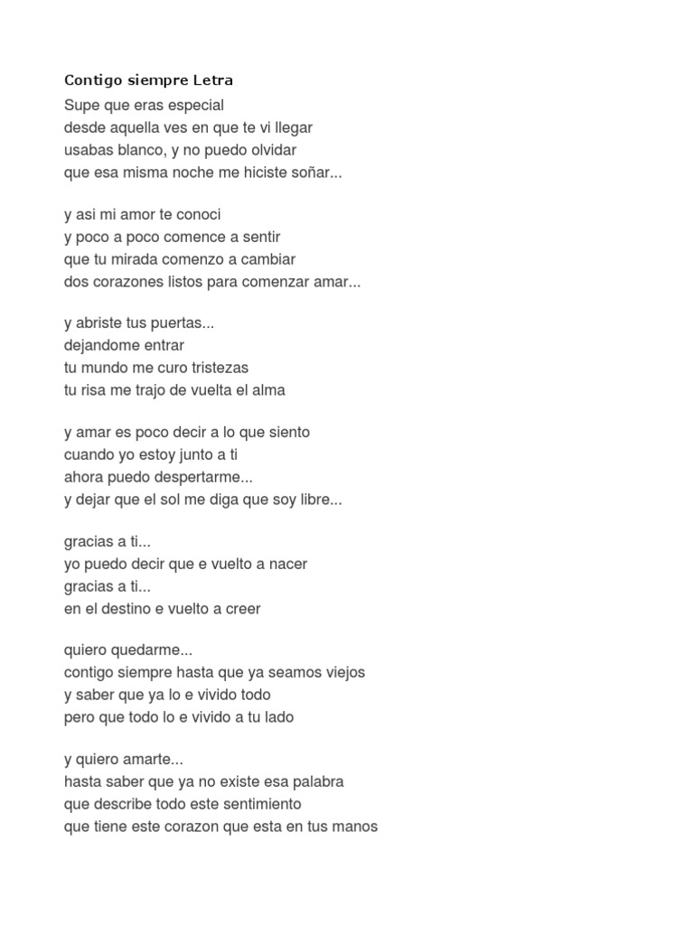 Contigo siempre - letra canción. Y yo que siempre defendí que era una tontería Y yo que tan decepcionado estaba del amor Y tú llegaste a hacerme ver lo que yo no quería Hoy mi pasado es solamente una buena. Lo sabes yo se que lo sabes Se nota no es fácil saberlo Se que tus caderas miden 24 besos.