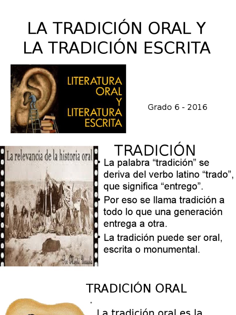SOCIOLOGÍA Transmisión de conocimientos costumbres creencias y obras artísticas o de pensamiento hecha de unas generaciones a otras la tradición oral mantuvo los rasgos más arcaicos de nuestra lengua. La tradición oral es la manera mediante la cual se transfieren los conocimientos la cultura las tradiciones así como los hechos tanto científicos como históricos de una comunidad a otra a través de relatos leyendas cuentos cantos los cuales pasan de generación en generación. Según la Iglesia Católica Romana la tradición apostólica es la transmisión del mensaje de Cristo realizada desde los inicios del cristianismo por medio de la predicación el testimonio las instituciones el culto y los escritos inspirados.